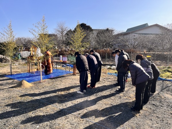 2月9日 この冬一番の冷え込みの日(午前7時時点で-5°C)、午前9時30分より当社倉庫新築工事の地鎮祭を執り行いました。